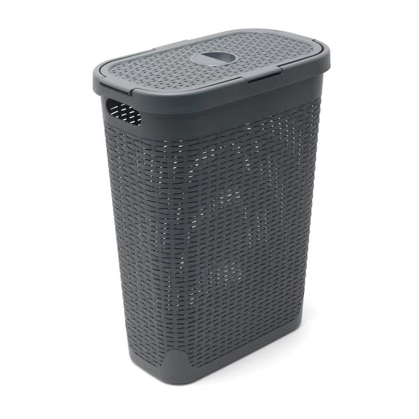 Featuring a slim and space saving shape, this charcoal grey basket is crafted with a faux rattan effect, complete with a lid and a capacity of 40 litres.