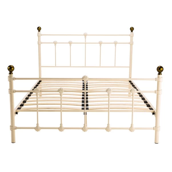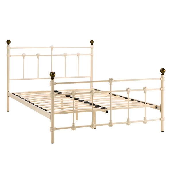 The Atlas Bed Frame has been beautifully crafted from metal for a stunning detailed finish. This traditional-style bed frame is finished in a choice of cream or black, depending on the look you’re going for. The antique brass finials add charm and character, whilst the sprung slatted base will give you a restful sleep night after night.