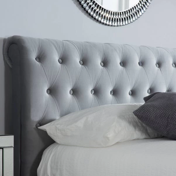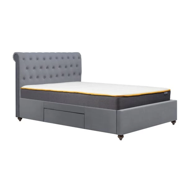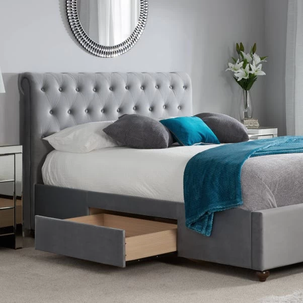 The elegant Marlow Storage Velvet Bed Frame is upholstered in luxurious grey velvet and features a stylish deep tufted headboard. It offers two spacious drawers built into the base, making it as versatile as it is beautiful. A solid slatted base provides firmer support and allows air to circulate beneath the mattress.
