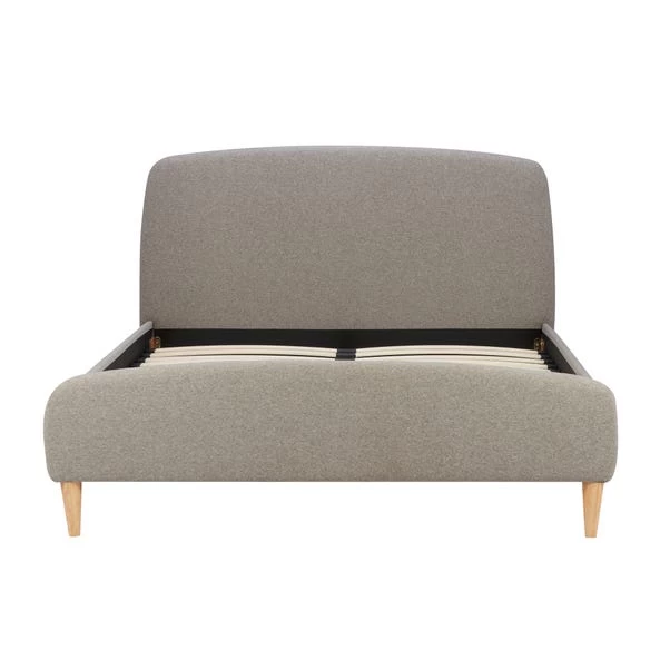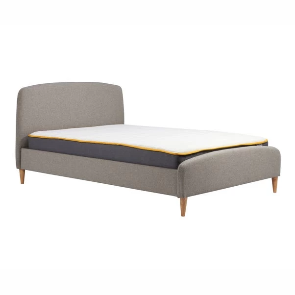 Gentle curves and stunning soft fabric makes this contemporary yet charming bed frame a beautiful choice for any bedroom. It is upholstered in a grey polyester with complimentary light wooden feet.