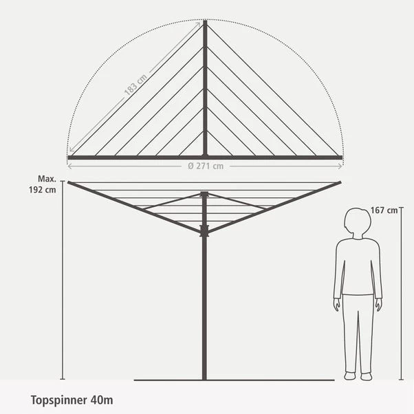 Easy to operate and wipe clean, this adjustable topspinner rotary washing line from Brabantia can be tensioned in three positions to cater for your different needs and spatial requirements. Made from a durable and reliable steel frame, this topspinner rotary washing line comes complete with a 5-year guarantee.