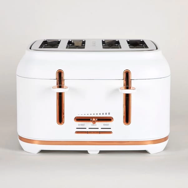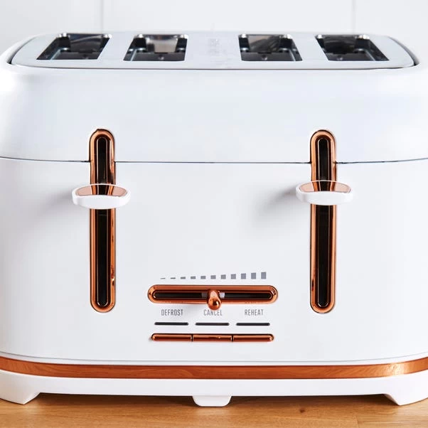Offering a practical four slice capacity, this matt white toaster features variable browning control dials, variable width bread slots with centering guides and high lift facility for added convenience.