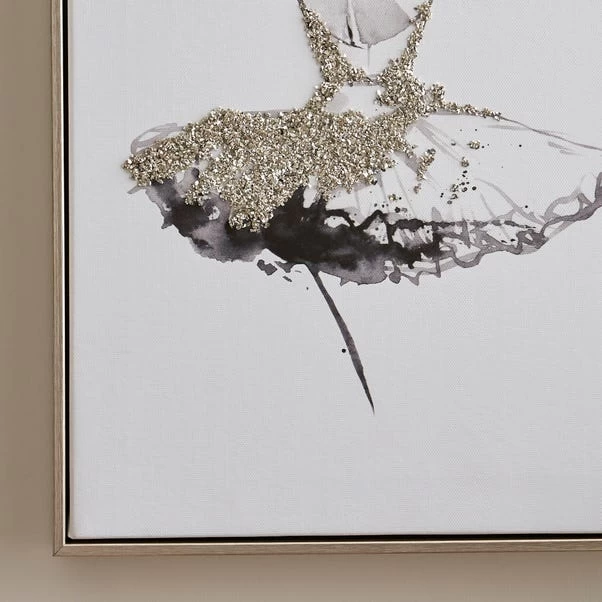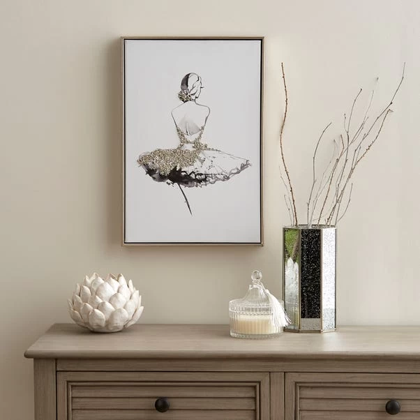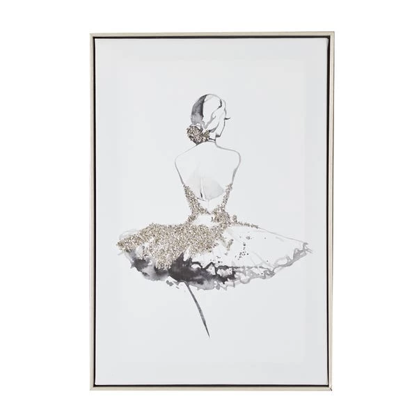 Perfect for bringing an elegant touch to your home, this beautiful framed canvas features a stunning watercolour-style print of a ballerina. Complete with silver coloured embellishments and a delicate champagne coloured frame, this stunning piece of art would make the perfect centrepiece for any home.
