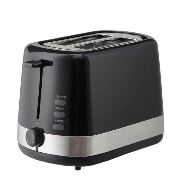 Designed in a modern black colourway, our 2 slice toaster offers 1700W power output with 3 added functions; cancel, defrost, reheat. Designed with blue LED illuminating lights and a slide out crumb tray for ease of cleaning, this 2 slice toaster is ideal for your home. This toaster comes with a 2 year guarantee.