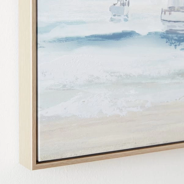 Modern, nautical inspired abstract art, perfect for adding colour and calmness to your living space. Featuring a printed heavy Ocean waves depiction with a wood frame, this tonal Boats Canvas is a beautiful and soothing piece for any room in your home. This piece comes with triangular wall fixing hooks for ease of hanging.