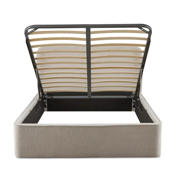 Part of the Curves collection, this storage bed has a sleek boucle textured finish. A solid headboard with a curved style gives the bed a beautiful modern look. The bed frame can be lifted to reveal an end opening, providing you with extra storage within your bedroom. This bed comes with solid slats that allow air to circulate to your mattress. Full assembly is required to build this bed.