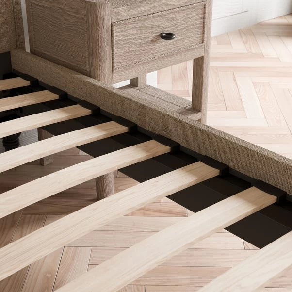 This bed frame is unique, stylish and practical. The sprung slatted base provides additional support for your mattress for added comfort and carefree nights of sleep.