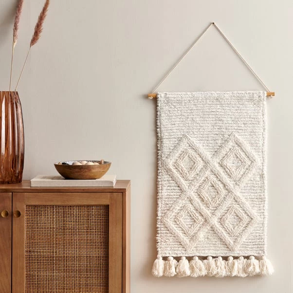 Hand woven, this beautiful piece with a textured and tufted geometric design will add a pop of style and colour to any room of the house. The large tassels at the base will help to add some texture to your home, making it the perfect wall hanging. With a soft cream colourway that will complement an array of home decors, this stylish piece is hung on a wooden pole with a rope hanging.