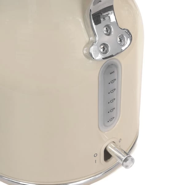 This Dunelm 1.7 litre capacity Jug Kettle brings a unique design with a modern cream colour which will look great in all kitchens. The generous capacity makes it possible to make up to 7 cups at one time, great for larger families and entertaining guests. Featuring a 360 degree swivel base this kettle is suitable for both right and left handed users and the removable lid and water filter creates for quick and easy cleaning at home to help keep your kettle lasting longer. The power on indicator is great for low light settings. For a new and matching kitchen collection, why not purchase the matching toaster and microwave appliances also available in this retro range. Supplied with a two year guarantee.