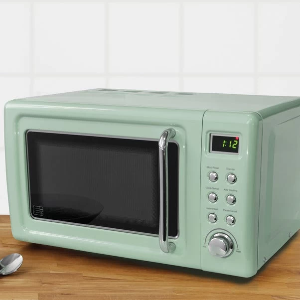 This 800 Watt motor microwave has a very generous 20 litre capacity for food and features five power settings and a defrost setting, suitable for all meal types and times of eating. The simple yet stylish seafoam colour alongside the retro design makes for a staple addition to any kitchen worktop. Featuring a programmable clock with a 60-minute digital timer this microwave is practical and useful in the kitchen. Supplied with an easy to remove glass turntable helps for quick and easy cleaning at home. It also has an end of cooking signal in case the user is out of the room and a pull door handle for ease of opening as well as a child lock for safe usage in a family home. This range is also available in yellow, grey, black and cream. Supplied with a two-year guarantee.