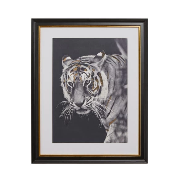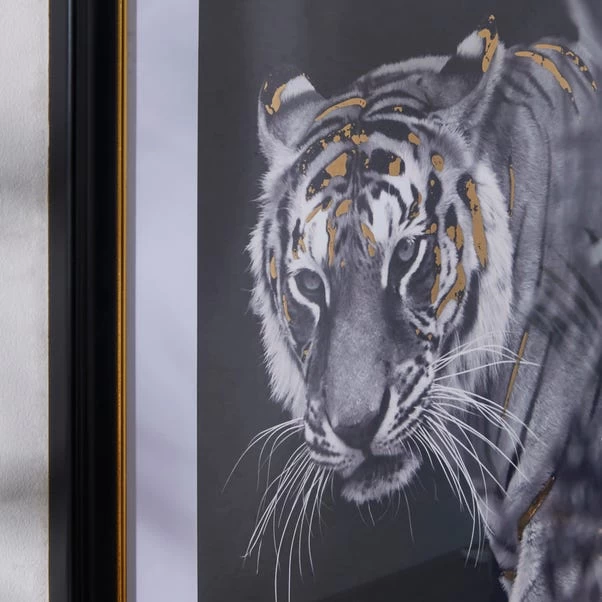 This framed print of a Tiger is perfect for any room that needs a little more life. Featuring gold foil details with a black and gold frame, this tiger print will make the perfect addition to any home. It is an 45x58cm print, perfect for any size wall.