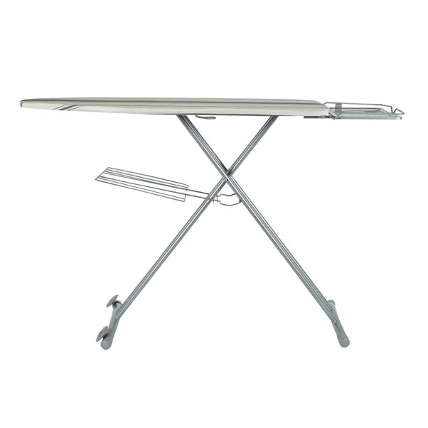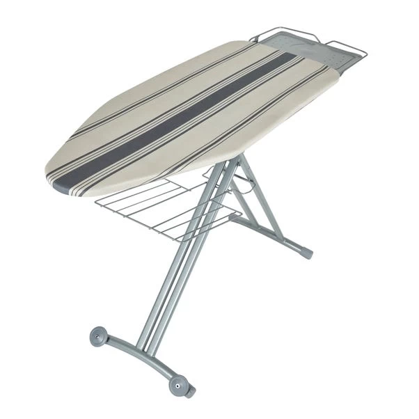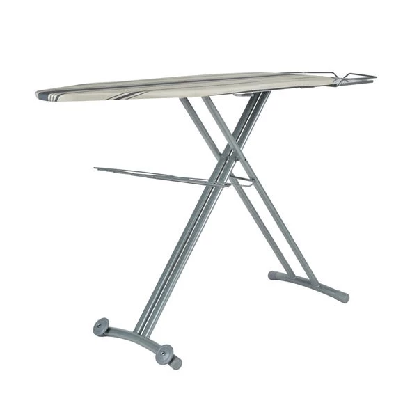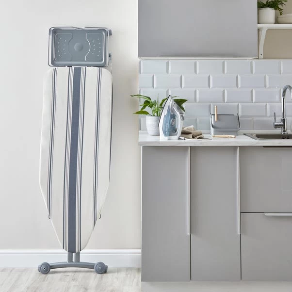 Made with a mesh top, this ironing board is both attractive and functional, with its modern colourway and adjustable height of up to 98cm. With a powder coated finish, this ironing board has a big steam iron rest, garment rack and wheels for easy moving, making it the ideal piece for all your ironing needs.