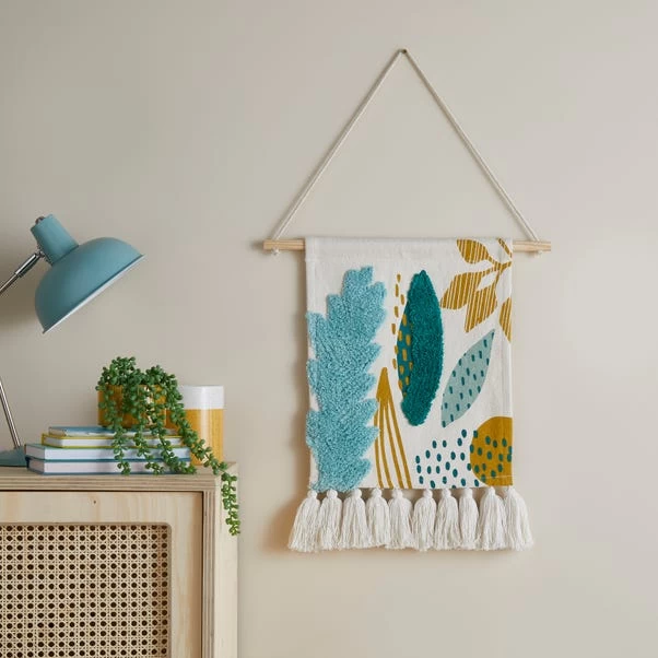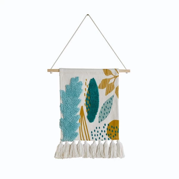 Featuring the Elements Floral Wall Hanging with a printed and tufted abstract floral leaves design. This beautiful hand-woven piece is hung on a wooden pole with a rope hanging. Designed with a natural base with pops of colour within the floral design and a natural tasselled edge at the base. This elements piece is perfect for adding a decorative touch to your walls.