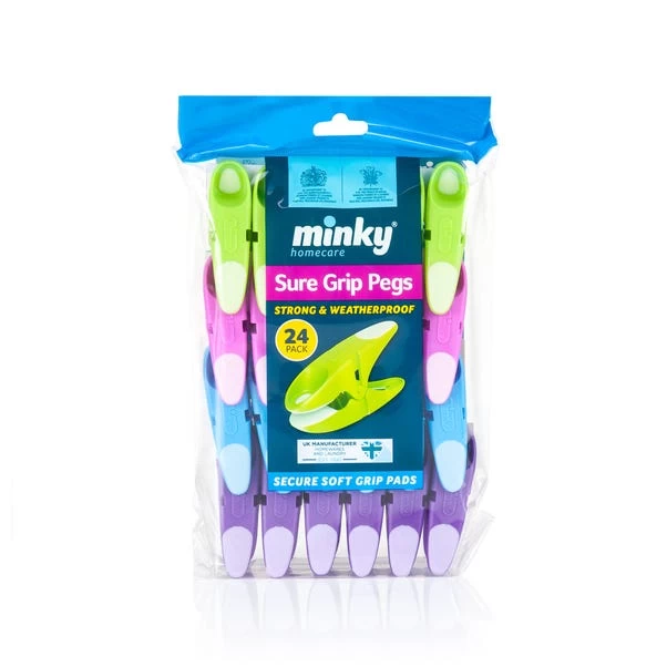 Constructed from hardwearing plastic with soft grip pads, these Minky sure grip pegs are rust resistant and come in a pack of 24.