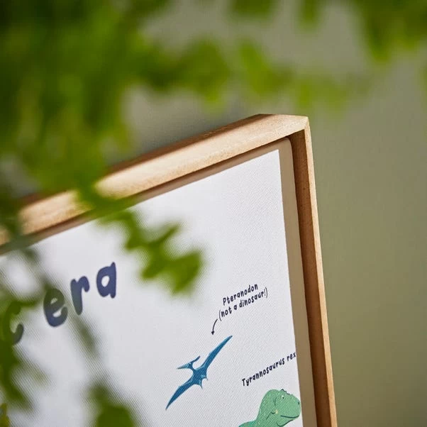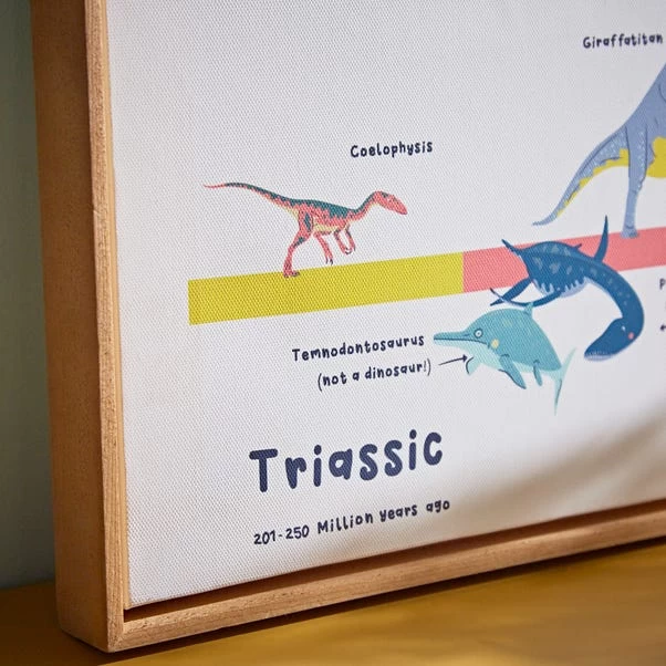 Featuring an array of prehistoric creatures, this fun canvas showcases the Mesozoic Era’s three time periods: the Triassic, Jurassic and Cretaceous. During this time the land gradually split from one huge continent into smaller ones. Changes in climate and the introduction of new plant life meant that dinosaurs and other reptiles evolved and became more diverse. Where did your favourites live? Was it the ocean, the land, or the sky? The canvas is bordered by a frame made from responsibly sourced, FSC-certified timber. By choosing this product, you are supporting responsible management of the world’s forests.