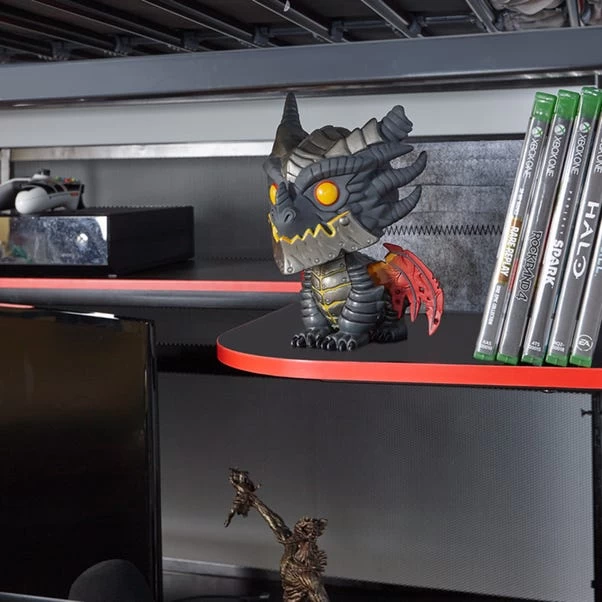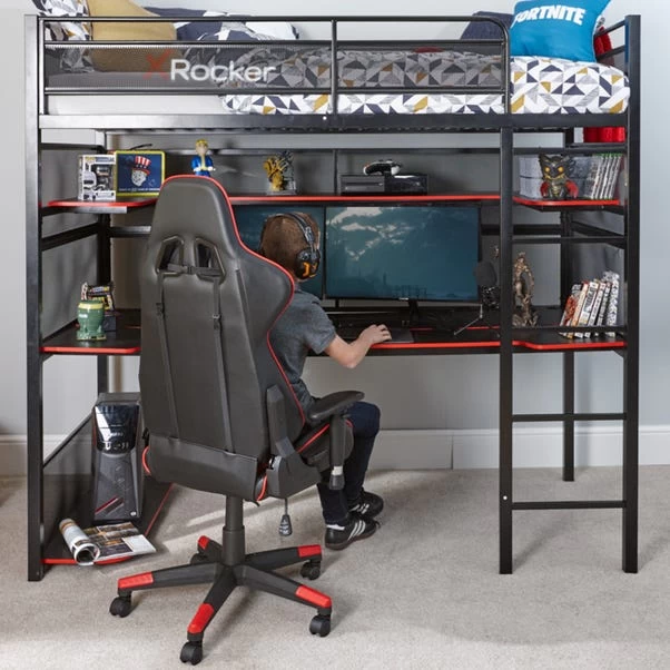 Bring the efficiently designed and versatile X Rocker Battlebunk Gaming High Sleeper Bunk Bed with Shelf & Desk to your bedroom for a high-tech and advanced set up. Constructed with a strong and durable metal frame with metal bed slats provides stability and long-lasting comfort. The bed also features spacious under-bed storage with a built-in desk, display shelf to store games consoles, accessories and PC hardware and a PC tray. The integrated desk space is sized to allow 2 PC monitors up to 32” for the ultimate gaming set up.